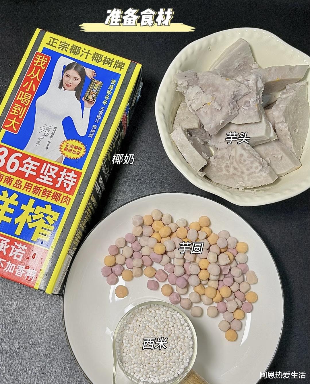 别看食材这么多,其实都是超市随手可得的普通食材。芋头最好选荔浦芋头,纤维细腻,香气浓郁;椰浆选择浓稠型的,味道更醇厚;西米一定要选小颗粒的,更容易煮透。