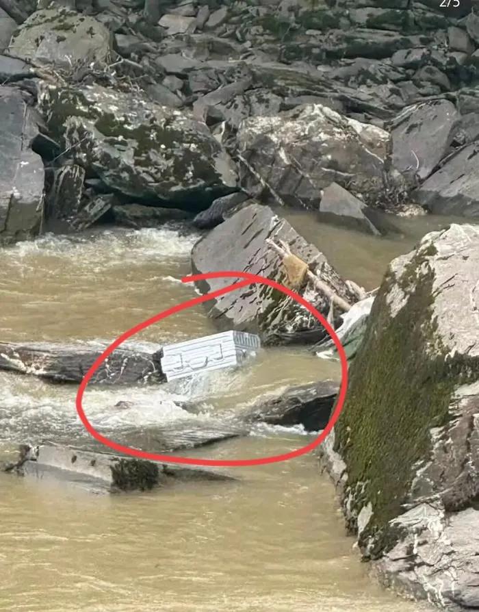 游客的旅行箱被水流冲到了石头缝里,背包被冲到岸边。