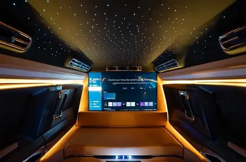 科技与豪华感满满:12.3英寸悬浮中控屏搭配第三代车机系统,支持语音控制、导航和娱乐功能,搭配14扬声器高端音响,音质媲美移动音乐厅。车顶的星空顶设计更是点睛之笔,配合64色氛围灯,夜间行车氛围感直接拉满,再加上全车隔音玻璃,把外界噪音隔绝在外,车内安静得能听清呼吸声。