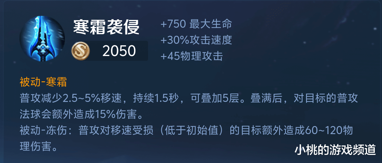 但是从属性效果的效果来看,好像又有点四不像,生命,攻速,伤害三种效果都并不突出,其实不然,寒霜袭侵的最强效果,其实有很深的属性联动意义。