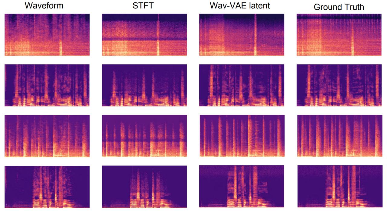 针对音频数据的其他表征空间,如波形空间、谱空间,团队也做出消融实验。对于语音、音效、音乐通用音频超分任务,波形隐空间达到最佳效果: