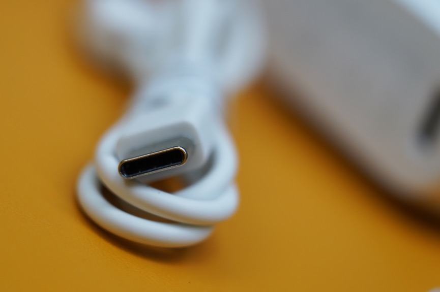 耳机收纳盒底部为产品相关参数标识,以及Type-C充电接口,并且细节处理较好;