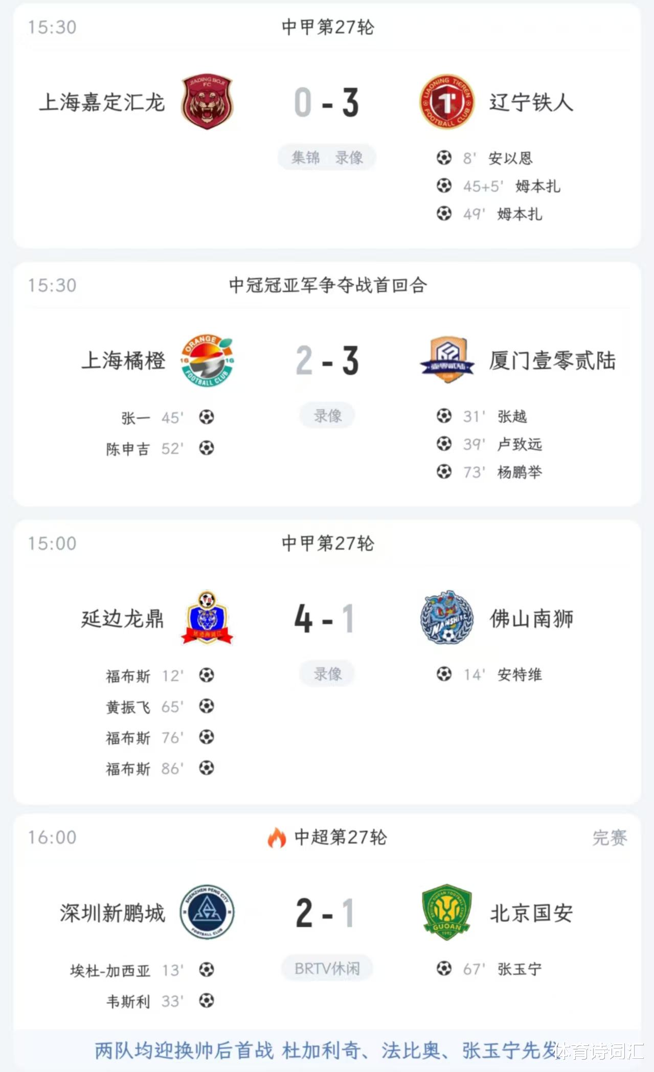 (2)【中甲辽宁争冠战】上海嘉定汇龙0-3辽宁铁人:赛季首次交手上海曾0-3惨败辽宁,本场上海选择科菲的单外援4231阵型,辽宁则是费利佩、姆本扎、邦本三外援以及中国台湾的安以恩等强援全部出战。