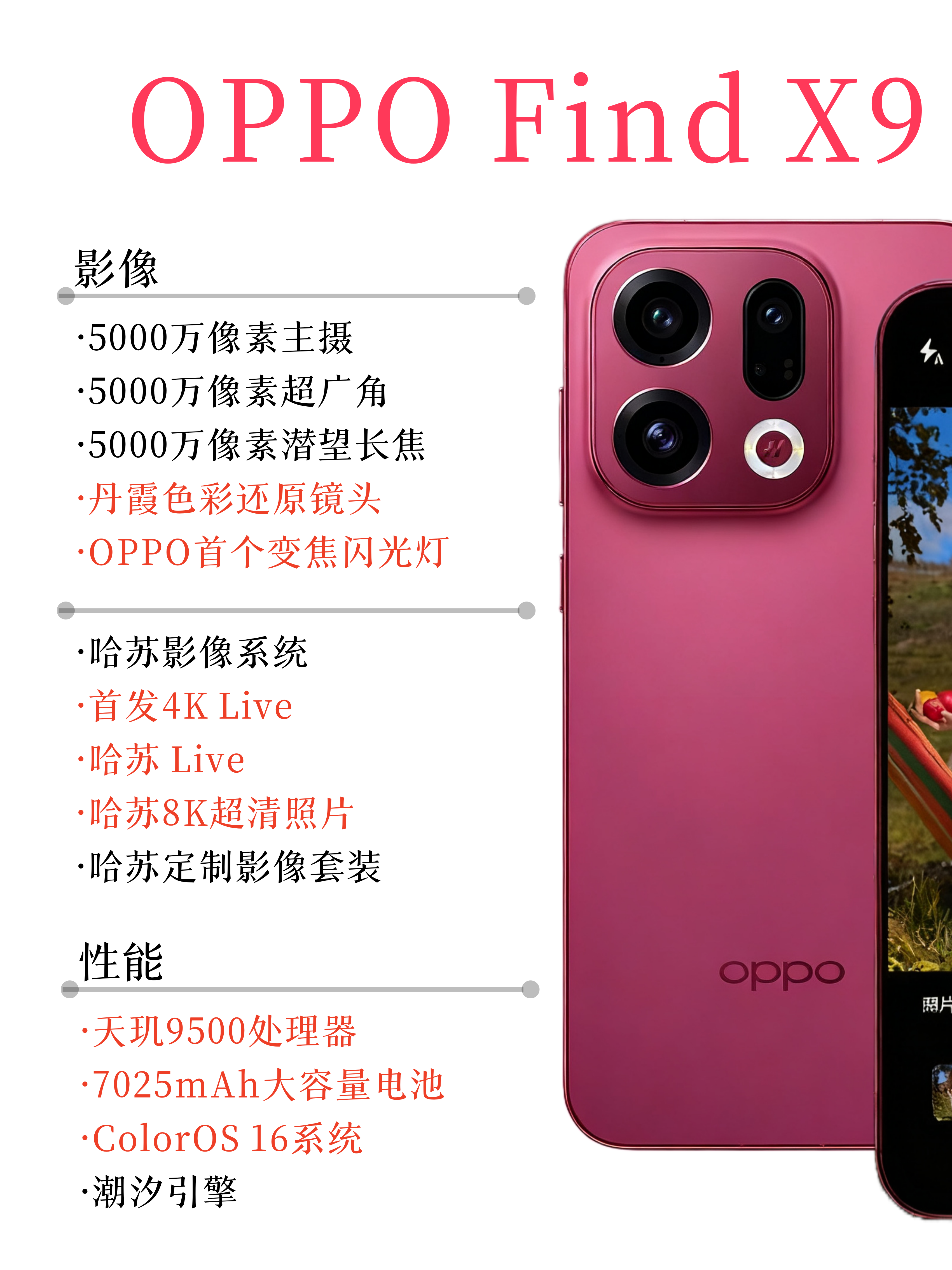 这回OPPO对手机的影像体验进行了大幅升级,光是镜头上,OPPO就为Find X9带来了丹霞色彩还原镜头,让其有望成为同档最强四摄。同时,OPPO还看到了当下用户对于Live实况的拍摄需求,联合哈苏、小红书等进行了一系列提升,比如哈苏 Live、4K Live等等,喜欢拍照的友友们绝对要蹲一蹲。