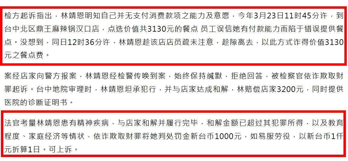 台媒报道,林靖恩到“鼎王麻辣锅”吃了3130元台币(约合700元人民币)的霸王餐,被店家提告诈欺,双方闹上法院。
