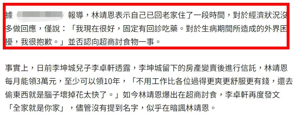 至于网友指她在便利店乞讨,林靖恩否认了,她感谢大家对她的关心,并透露已经回老家(父亲家里)住了好一段时间。