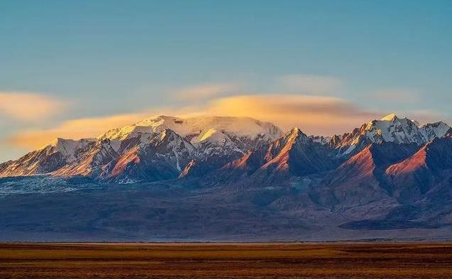 中国新疆帕米尔高原,黄昏时分的雪山与天空|