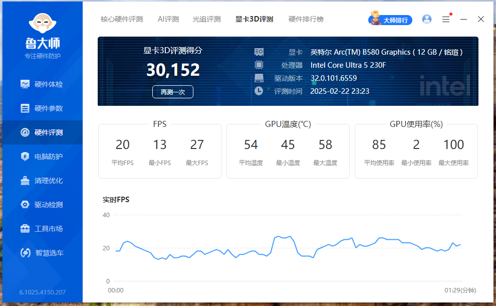 基础性能测试:Ultra5 230F的功耗实测仅为90w左右,温度也只有60℃,那我对这块显卡的潜力也是十分好奇,所以本人采用一些基础测试来看看它的表现。