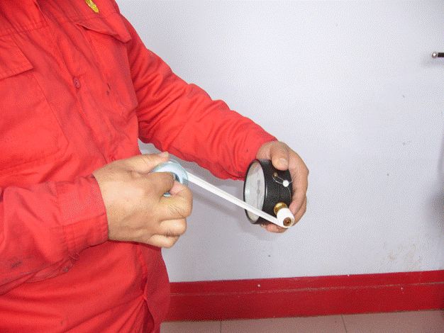 将检验合格的压力表在螺纹上按逆时针方向缠上密封带,注意不要堵塞进气孔。