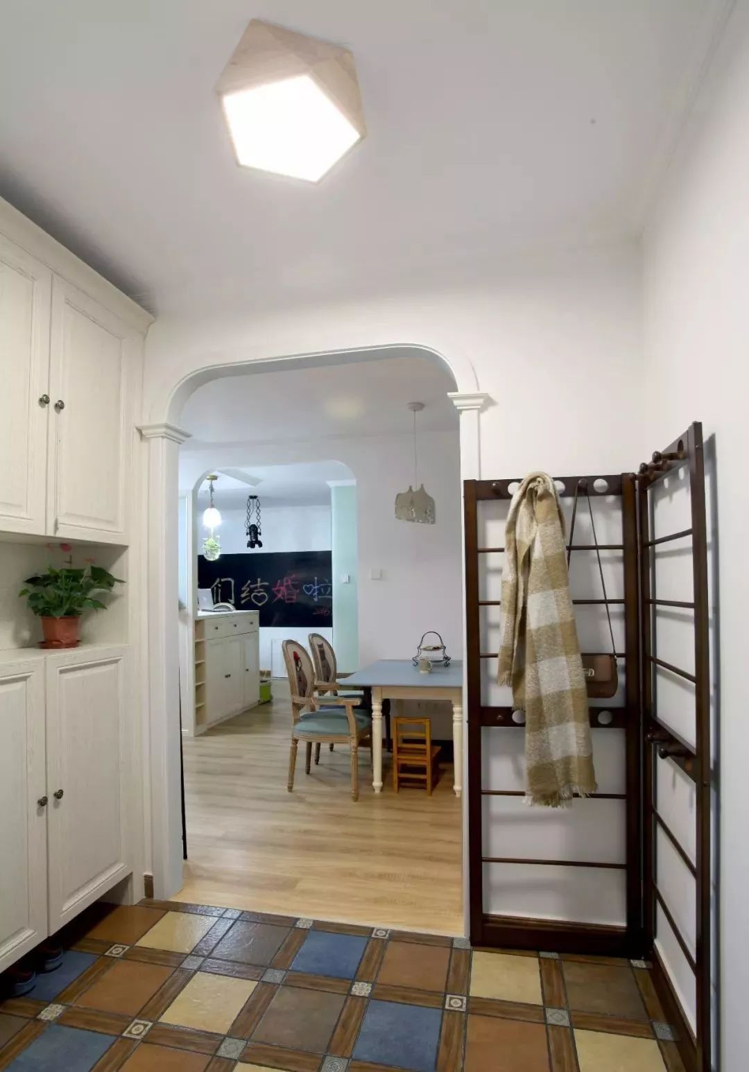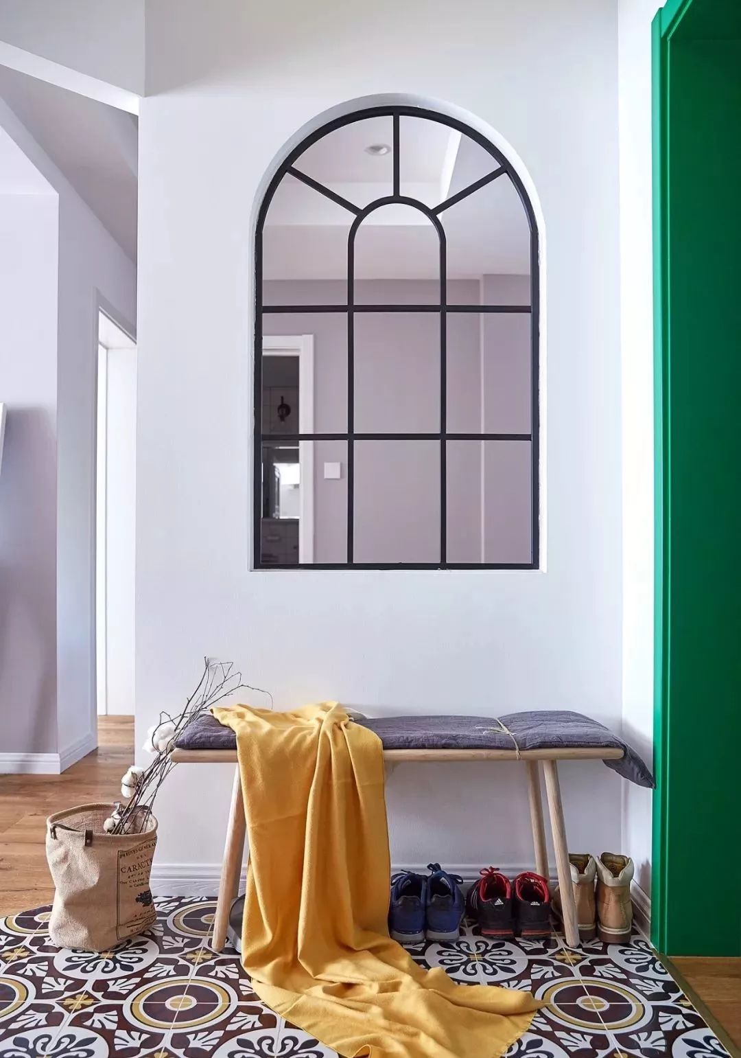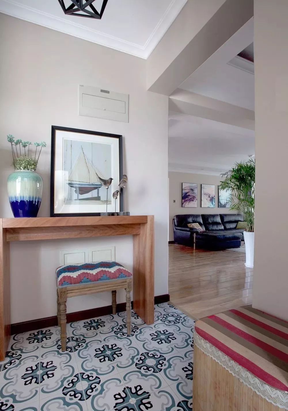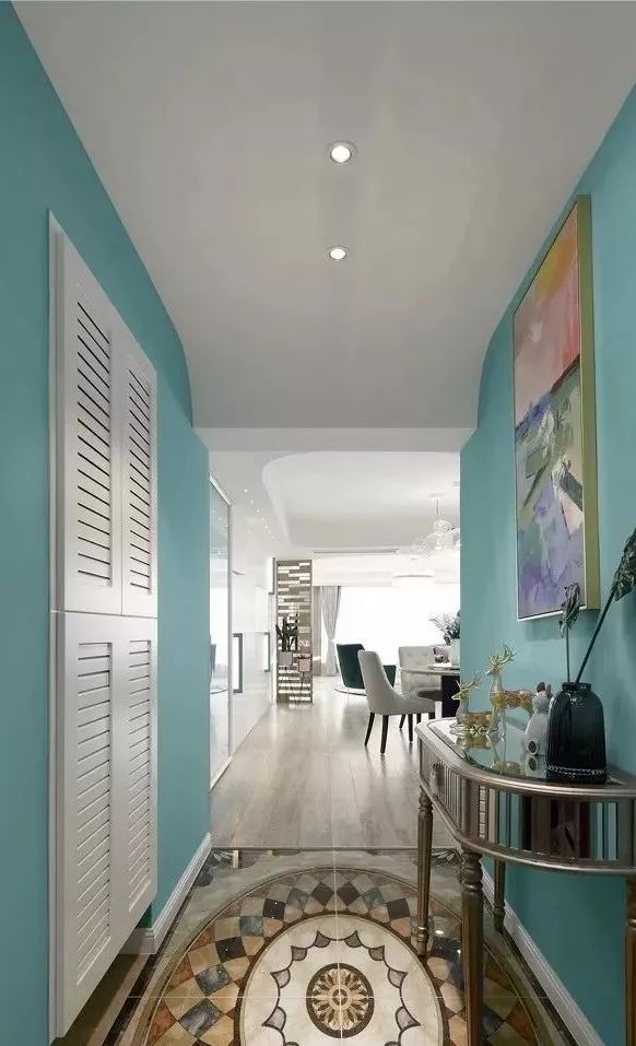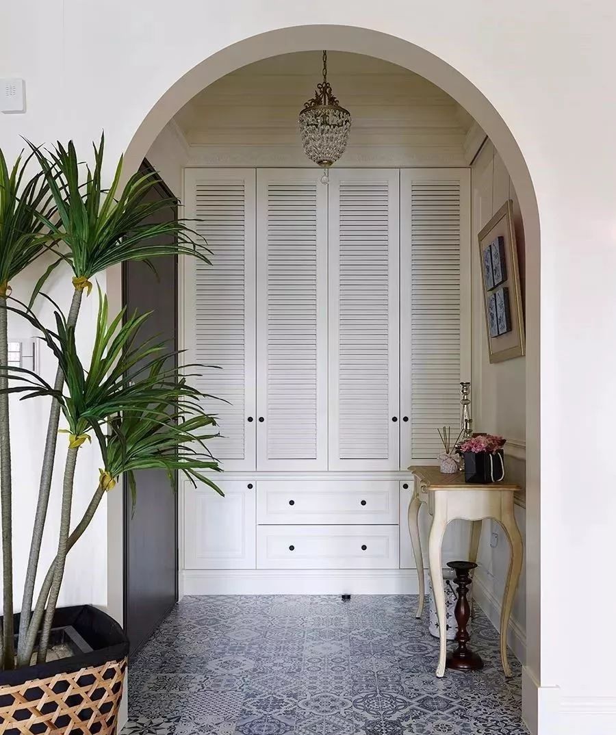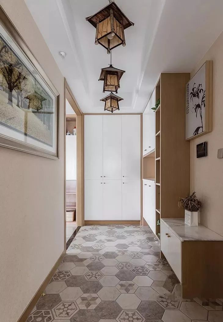 铺木地板的居室,不妨给玄关选择一些花砖,不仅提升入户的颜值,还极大方便了清洁,毕竟玄关日常进出最容易脏了。一些图案丰富,颜色略深的花砖,使用相对耐脏很多。