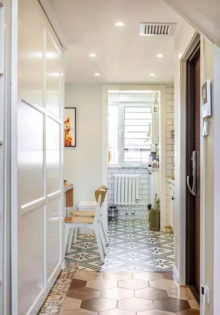 六边砖+花砖结合,看着有些不搭,但整体效果又让人觉得个性。与餐厨的花砖连在一起,十分潮流。