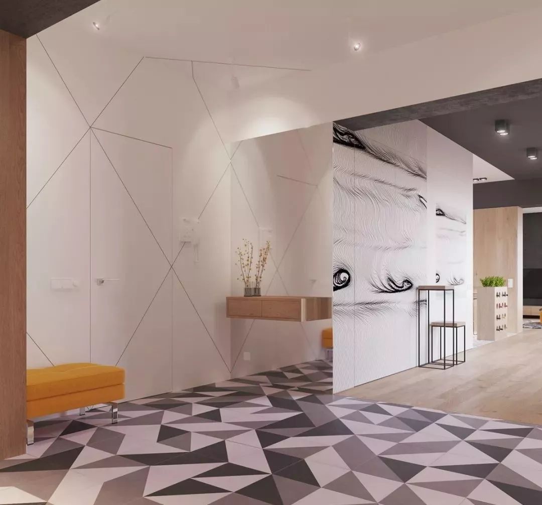 灰白黑三角感的瓷砖,用于玄关又是另一番美感,大面积铺设让入户更与众不同,搭配墙壁一些线条、饰品等,满满的艺术气息。