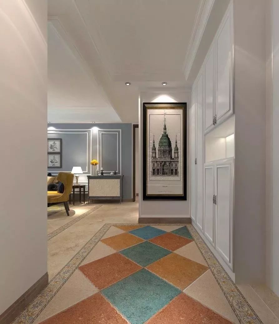 一些色彩丰富的瓷砖,用于玄关一样可以带来独特美感,大家在装修时,自行搭配,都会有独一无二的气质。这款中间蓝绿黄橙瓷砖,菱形铺设,周围一圈花砖,十分个性。