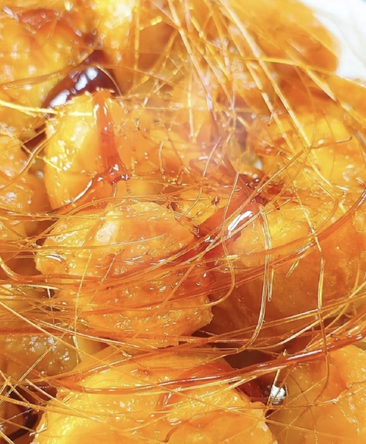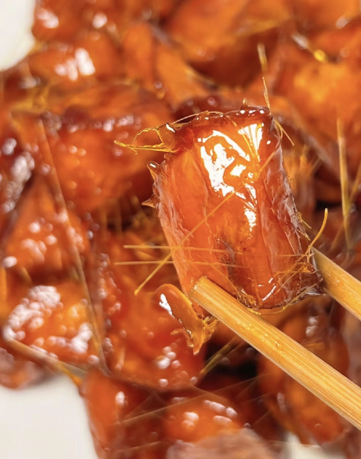 咬一口,脆壳带着焦糖的焦香,内里的地瓜甜糯绵密,甜而不腻,口感层次丰富。其实拔丝地瓜不只是一道甜品,更是刻在北方人记忆里的年味。小时候逢年过节,奶奶总会端上一盘拔丝地瓜,孩子们抢着夹起地瓜比赛拉糖丝,丝拉得最长的那个,总能得到长辈的夸奖。如今自己下厨做这道菜,才懂那根糖丝里藏着的不只是甜味,更是一家人围坐在一起的温暖。