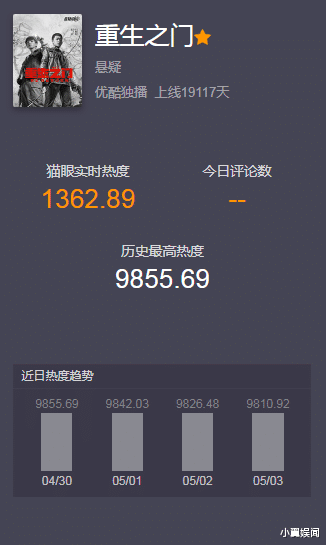 下面要说是由杨冬执导,张译、王俊凯领衔主演的优酷自制剧《重生之门》,相信不少人目前都在刷这部剧吧!这部剧是在4月27日在优酷悬疑剧场独家播出的,一开播就掀起了一播高潮,迅速霸占了不少榜单的第一名,热度在全网那是非常的高。