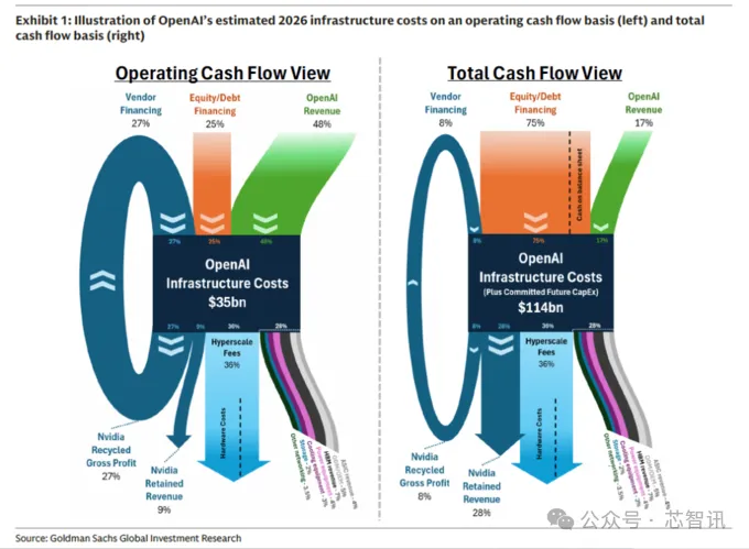 高盛也一份最新的报告中指出,OpenAI在2026年的年度运营基础设施成本(包括推理、训练、人员等)约为350亿美元。在这笔支出中,OpenAI自身收入贡献约48%,供应商融资贡献约27%,外部股权/债务融资贡献约25%。