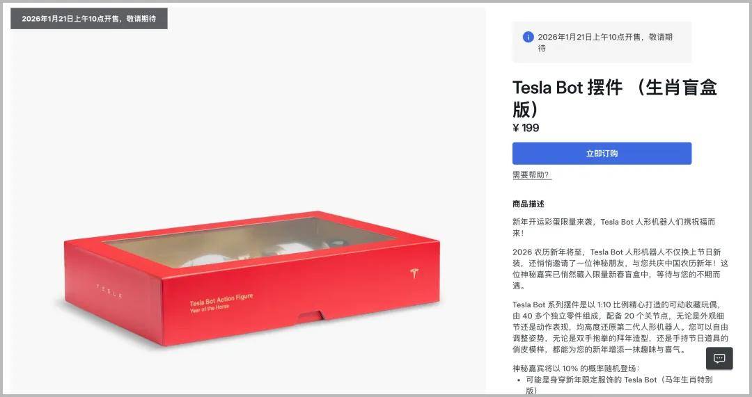 其最大亮点在于IP化设计和营销策略:采用“金闪闪”的配色,以10%的概率随机出现身穿新年限定服饰的Tesla Bot或神秘嘉宾版本。