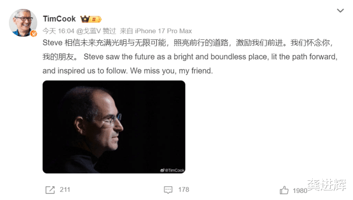 在乔布斯逝世14周年的日子,库克公开表达对他深深的怀念,“Steve相信未来充满光明与无限可能,照亮前行的道路,激励我们前进。我们怀念你,我的朋友。”不难看出,乔布斯是苹果不可或缺的精神图腾,虽然他已离开多年,但至今仍对苹果产生深远影响,激励库克和苹果员工打造更伟大的产品。