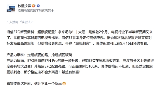 受以旧换新补贴政策、大尺寸面板成本回落等利好驱动,今年电视市场消费热情持续升温。与以往不同的是,消费者对“概念营销”愈发理性,转而追求参数透明、配置扎实、不完套路的产品。在此背景下,近期知名博主“秒懂投屏”爆料,号称“旗舰刺客”的海信E7Q新品即将发布,这款产品在屏幕、背光、芯片等配置实现全方位升级,以超越同级的价格诚意,重新定义必买电视的标准,计划近期换新的消费者值得重点关注。