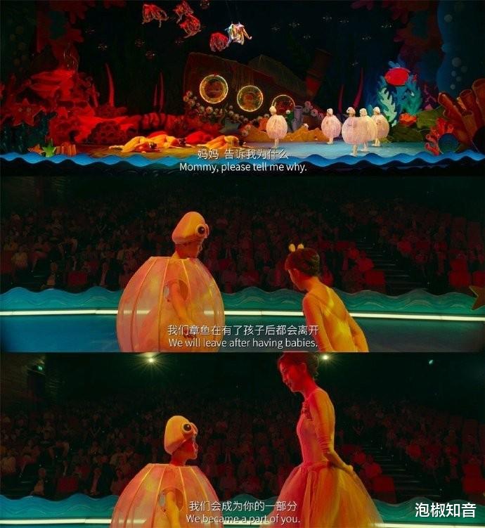 在舞台剧场景中,女老师们带领一群孩子,孩子们皆身着章鱼造型的裙子,这一设计绝非心血来潮。深入探究便可知,在现实世界里,章鱼怀孕生子时会选择绝食,直至将自身养分全部供给幼崽,直至死亡,这一过程充满了悲壮色彩。而影片最后出现父亲炸女儿的情节,很难说不是对此处暗喻的一种呼应,这般情节着实讽刺且令人触目惊心。手上的刺青、车上的挂件呈现章鱼形象,这其中无疑隐藏着诸多不为人知的秘密,亟待观众去挖掘、去解读。