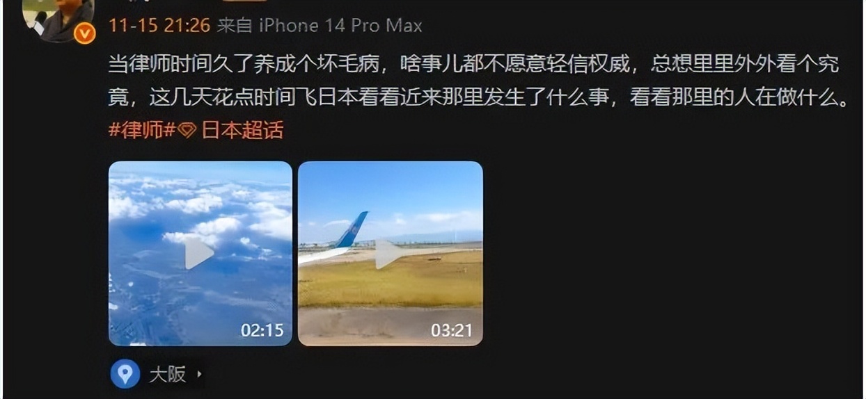 关于中国游客近期避免前往日本旅游的建议,发布次日那个前全国人大代表、知名的律师就专门从哈尔滨飞到日本,说“不轻信权威”。