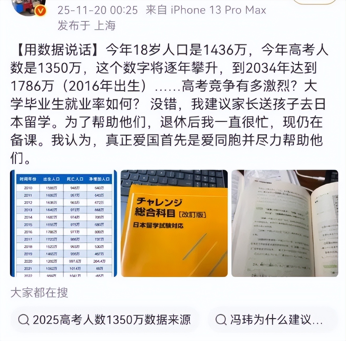 同样,在教育部发布中国人赴日留学预警之后,有个广大网民非常非常熟悉的大学教育,在11月20日专门在社交媒体上发帖,呼吁、建议中国家长把孩子送到日本留学,还说这才是“真正爱国”。