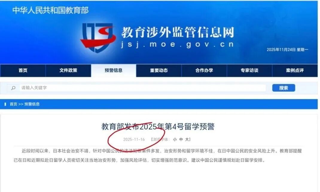 11月14日,外交部领事司发布消息提醒中国公民近期避免前往日本。11月16日,文化和旅游部发布消息提醒中国游客近期避免前往日本旅游,教育部发布留学预警,建议中国公民谨慎规划赴日留学安排。