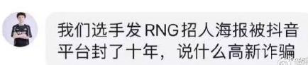 最后就是一个小趣事了,关于RNG招募青训的,是一个RNG的员工/前员工,在群里爆料,RNG当时让选手发布招募青训的广告,结果被平台判定成高新诈骗,直接给封了十年。
