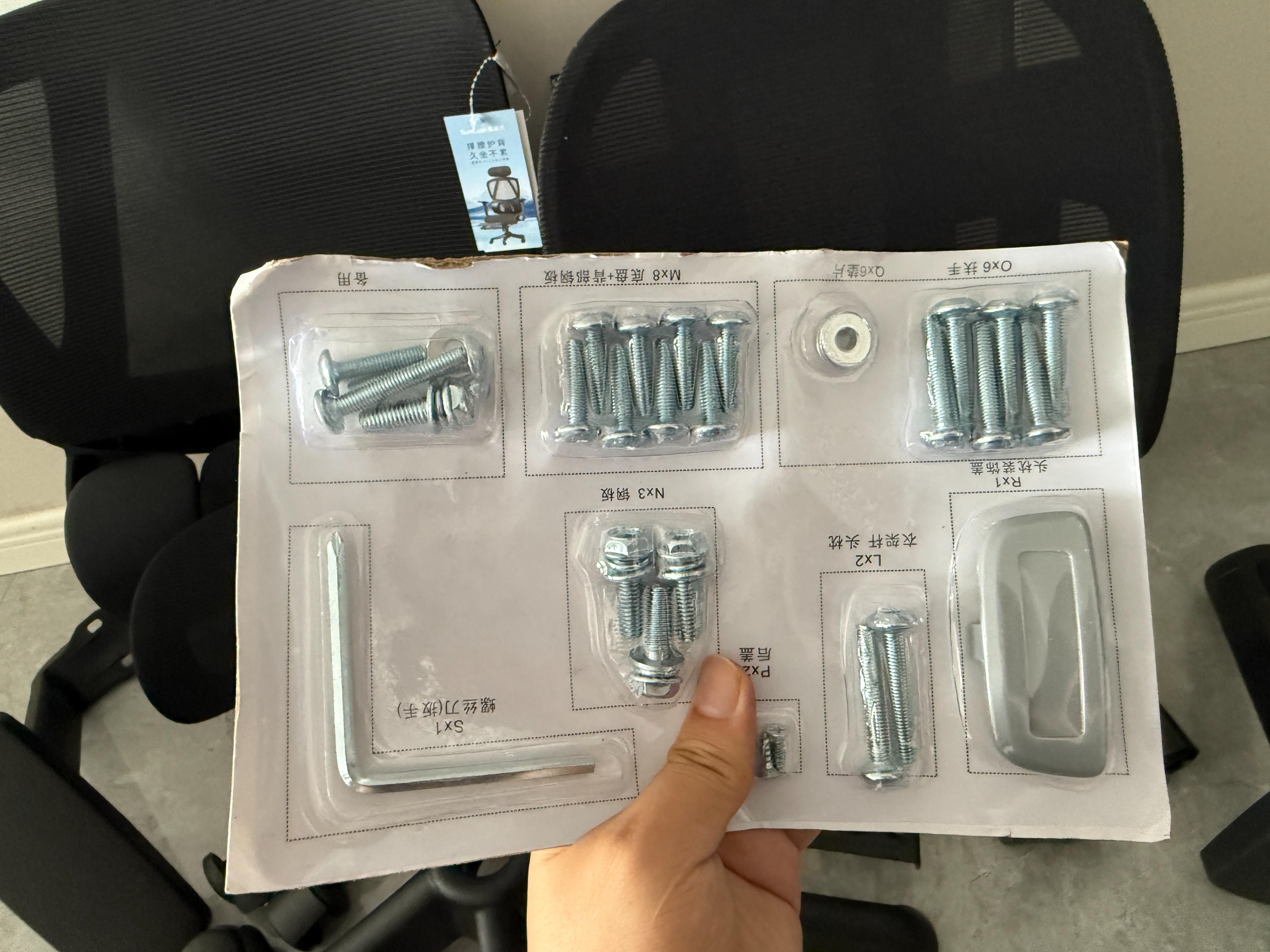 这款椅子采用散件发货的方式,需要用户自行组装。不过,大家无需担心组装难度,包装清单中附有一份详细的带图例步骤的安装说明书,螺丝、工具的包装上也都标有具体的代号和数量,甚至还贴心地送了几颗备用螺丝,以防万一。