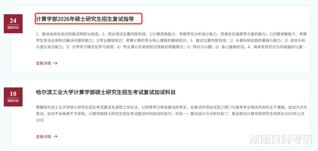 哈尔滨工业大学计算学部发布了2026年硕士研究生招生复试指导,此前还公布了复试加试科目,有报考该专业的同学一定要重点关注。