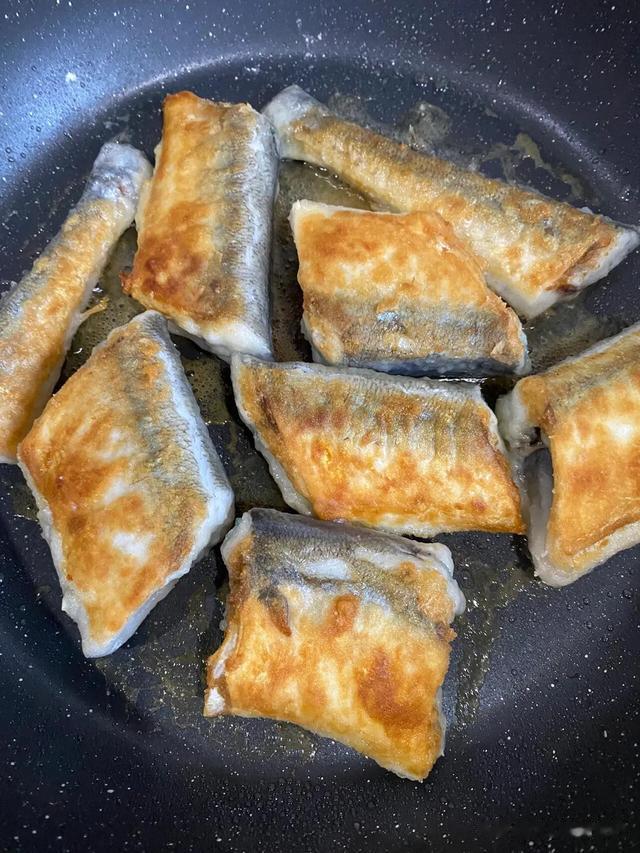 2. 煎鱼:牢牢锁住鲜嫩汁水:鱼段均匀裹上一层薄面粉,这样能防止粘锅。热锅后放入猪油,猪油煎鱼可比植物油香多了。等油热后,放入鱼段,煎至两面金黄定型。这里要注意,别急着翻动鱼段哦!煎好后盛出备用。