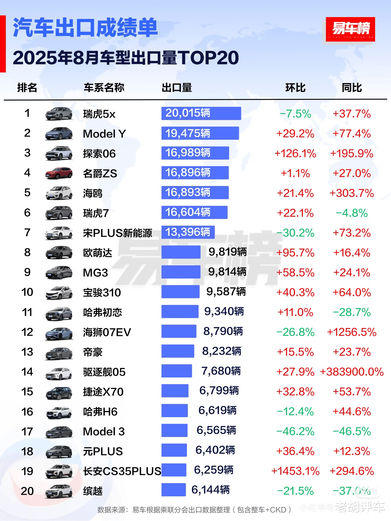 明星车型宋 PLUS 新能源以 16.7 万辆的出口量登顶车型榜冠军,成为全球化突破的 “尖刀产品”。更值得关注的是,比亚迪在 8 月出口 TOP20 车型中独占 5 席,王朝、海洋系列形成的 “集团军作战” 态势,印证了其产品矩阵的国际竞争力。
