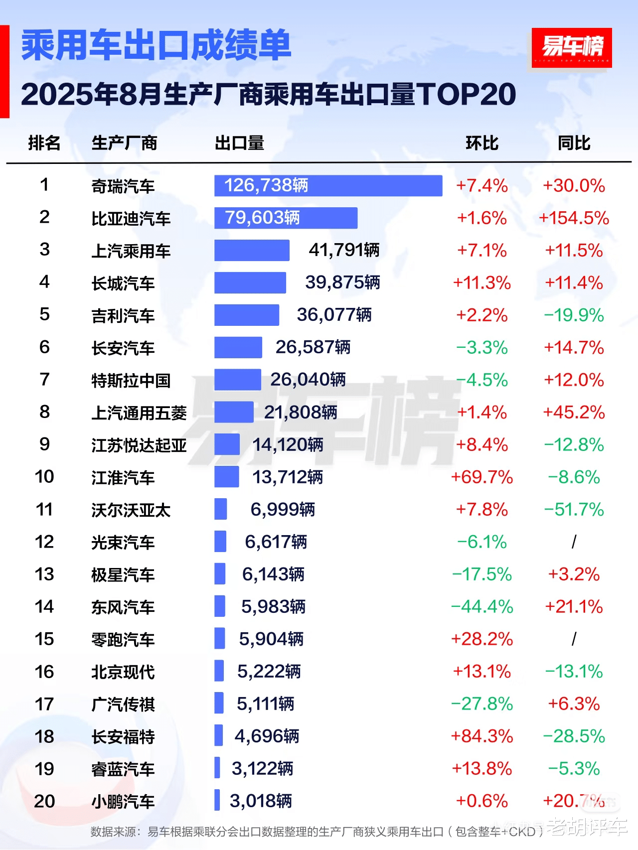 8 月乘用车出口数据 79,603 辆,比亚迪出海再秀亮眼成绩,用 154.5% 的同比增幅创下中国车企出海新记录。接近 8 万辆的单月成绩,不仅让其稳居全球车企出口榜次席,更以行业第一的增速远超同类竞争者。拉长时间轴看,2025 年 1-8 月累计出口 60.1 万辆的规模,已将去年全年海外销量远远甩在身后。