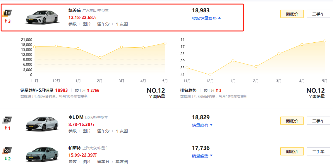 凯美瑞是一款资历较老的合资品牌中型车,在该细分领域始终占有一席之地,因为它与迈腾、帕萨特一同被人们视为中型车领域常青树。第九代车型刚出的时候,凯美瑞17.18万元的起售价被新能源车和一众竞品打得毫无还手之力,销量甚至滑出了细分领域前五。然而到了今年,凯美瑞好像一下子又站起来了,月成交量在1.5万台左右徘徊,今年5月份更是卖出了18983台的好成绩,问鼎中型车细分领域第一名。
