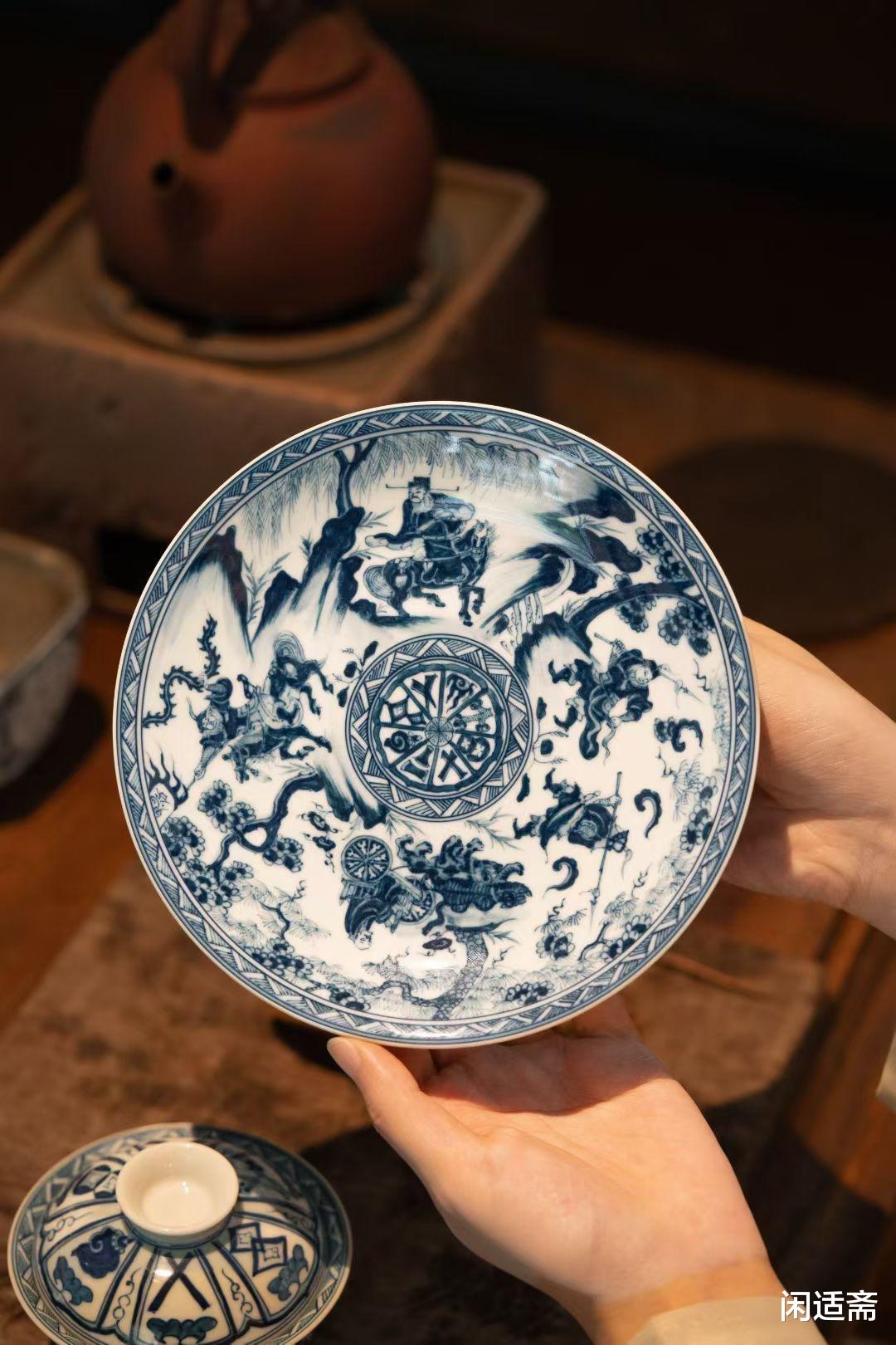 瓷器之上,鬼谷子下山的经典场景被细腻勾勒:画面中央,鬼谷子稳坐于虎豹牵拉的车中,衣袂轻扬,神色自若,眉宇间透着运筹帷幄的智者风范,仿佛正胸有成竹地为弟子指点迷津;车前,步卒手持长矛开道,身姿矫健挺拔,步伐沉稳有力,将 “保驾护航” 的忠诚与果敢展现得淋漓尽致;一侧,青年将军纵马挥旗,战袍随风飘动,眼神锐利坚定,意气风发的姿态中满是少年英气;后方,苏代骑马殿后,神情沉稳持重,目光扫视四周,尽显老成持重的谋士风范。