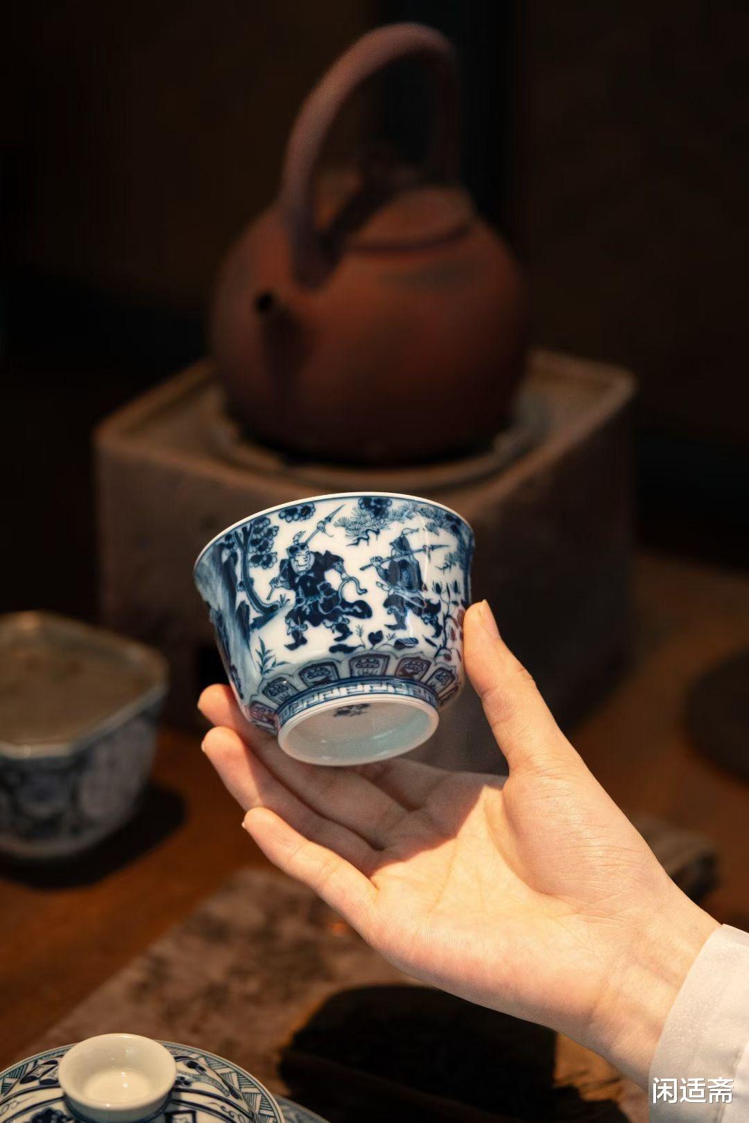 除了人物刻画生动传神,杯身的背景营造同样精妙。山石以简洁的青花线条勾勒轮廓,再以深浅不一的钴料渲染层次,仿佛巍峨的山峦矗立其间;树木枝干虬劲,叶片疏密有致,青花的浓淡变化让枝叶更显生机;地面的小草、远处的云雾以写意手法点缀,既丰富了画面层次,又将 “下山” 场景的紧张与庄重氛围烘托得恰到好处。每一笔青花的晕染、每一处线条的转折,都遵循元青花 “发色浓艳、笔触豪放” 的特点,松木柴窑的烧制工艺更让青花色泽温润饱满,釉面泛着自然的酥光,仿佛从千年历史中走来,尽显古典艺术的厚重与雅致。