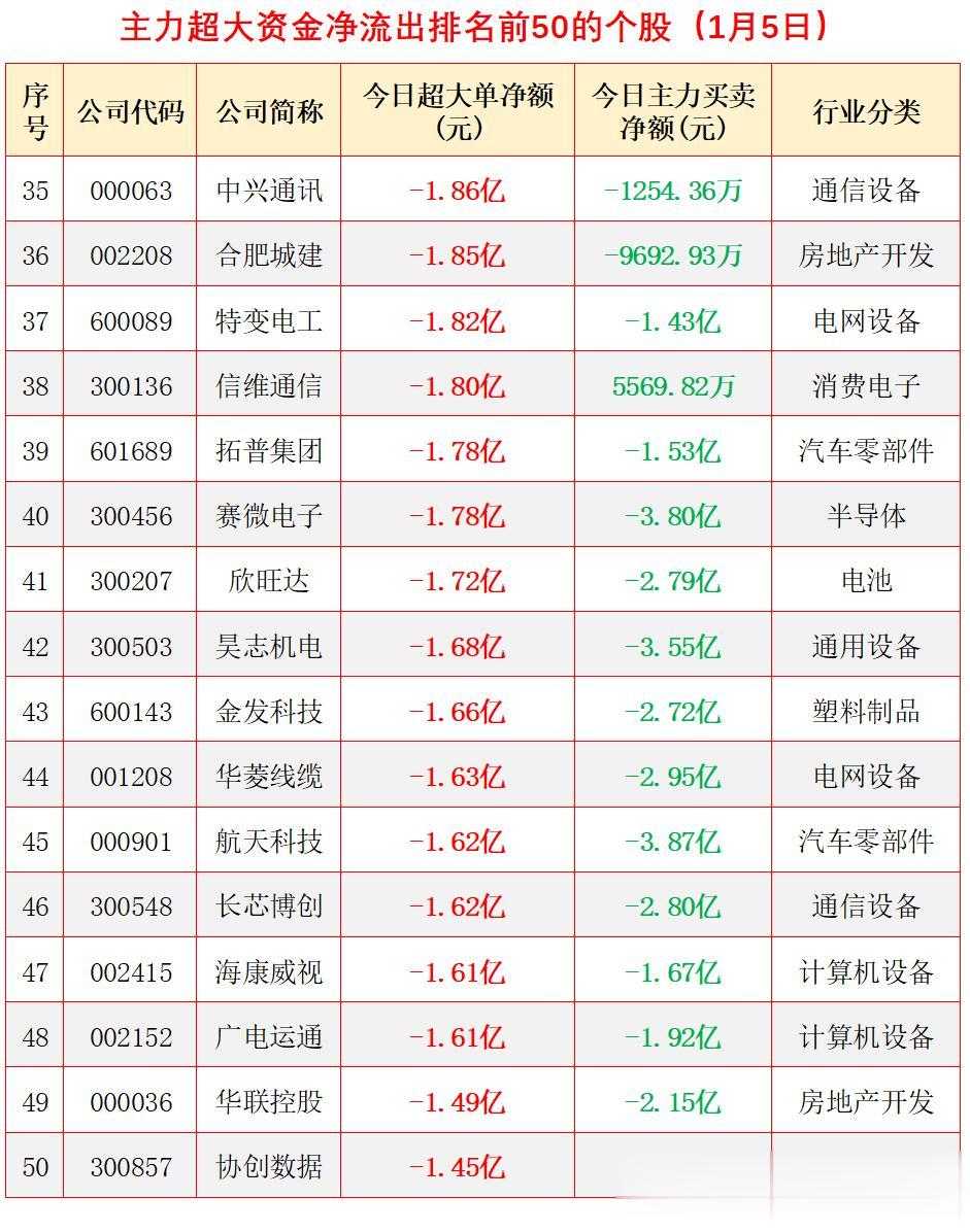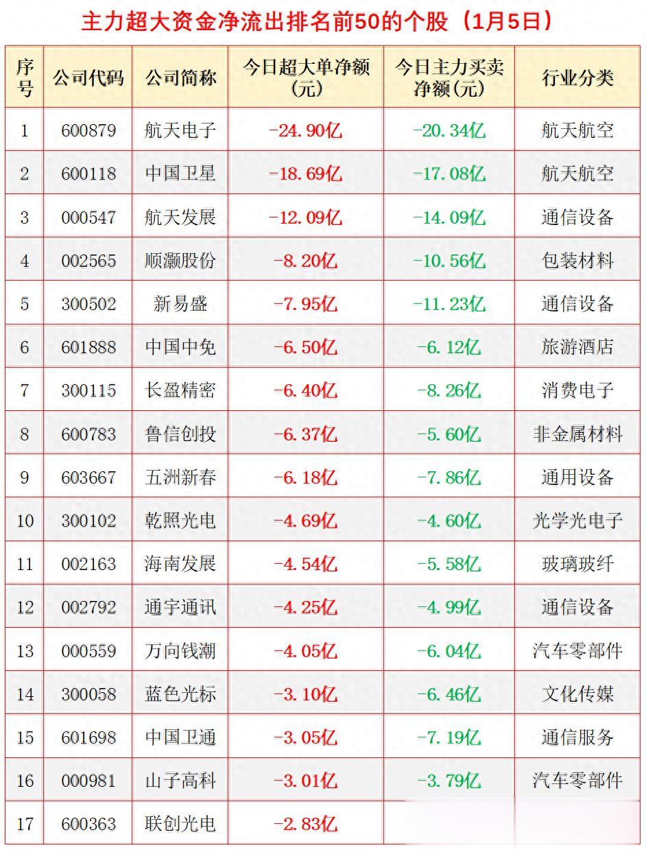 对短期而言,需警惕高位题材股回调风险,尤其要规避资金集中流出的热门板块。以下梳理了今日主力超大资金大幅净流出排名前50位的个股,仅供个肌主力资金动向分析,不构成任何投资方面的建议。