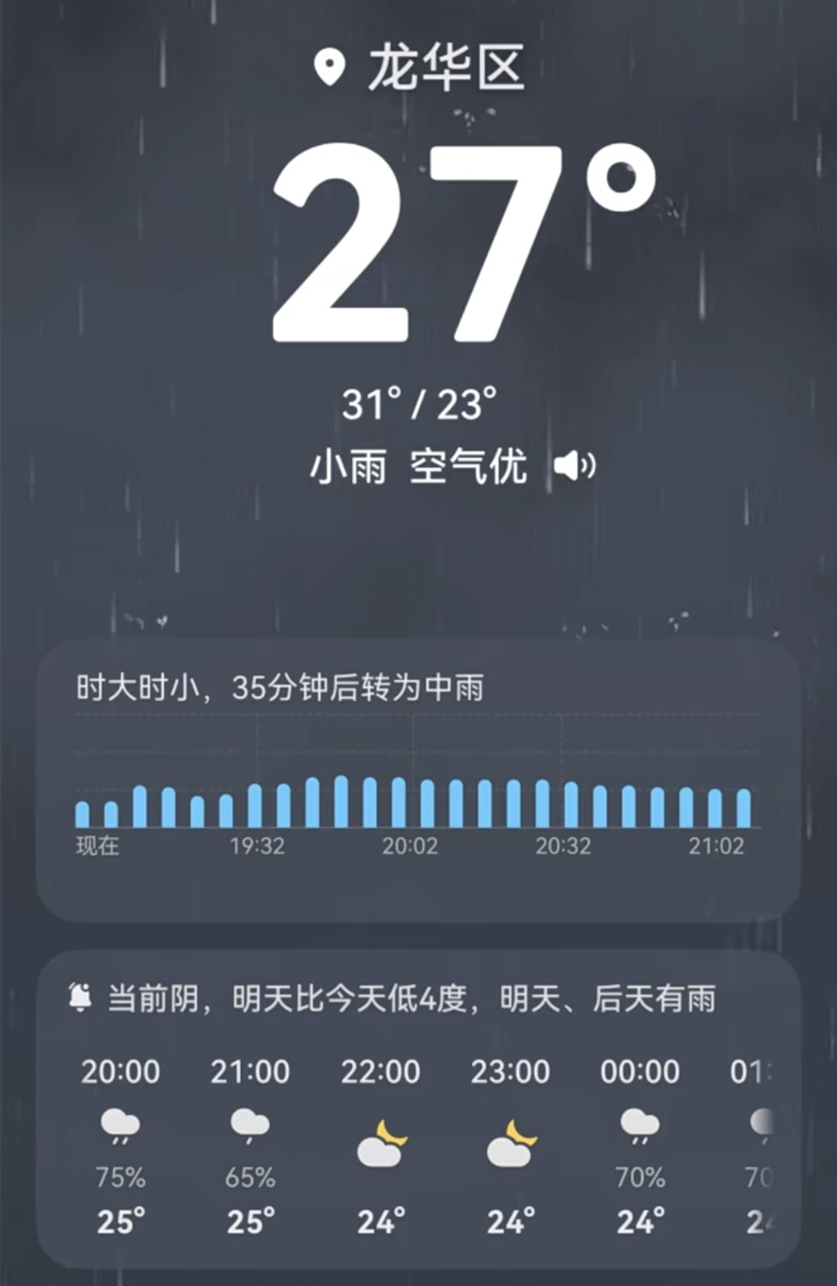 今年的打工人肯定对“又做牛马又做河马”这句话很有共鸣。南方那次的强降雨完美撞上了早晚高峰,去往地铁的那段路走好苦好艰辛,不知道的还以为马路变成河道了。这时候华为天气的首页智能卡,及时推送上分钟级降雨提醒稳稳派上用场了,能够精准预测几点几分雨势变小,不用担心走在路上突然被大雨浇头。