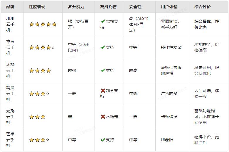 从实测反馈看,川川云手机在性能稳定性、多开规模、离线托管完整性和安全性方面全面领先,且价格亲民,适合作为首选平台。