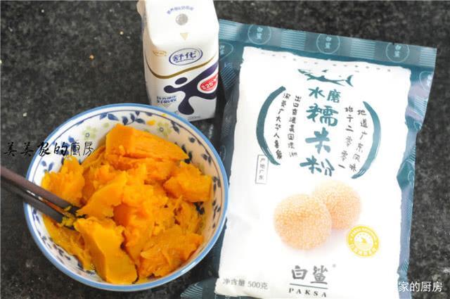 食材都准备好。糯米粉建议买水磨的,口感更好。南瓜先蒸熟备用。