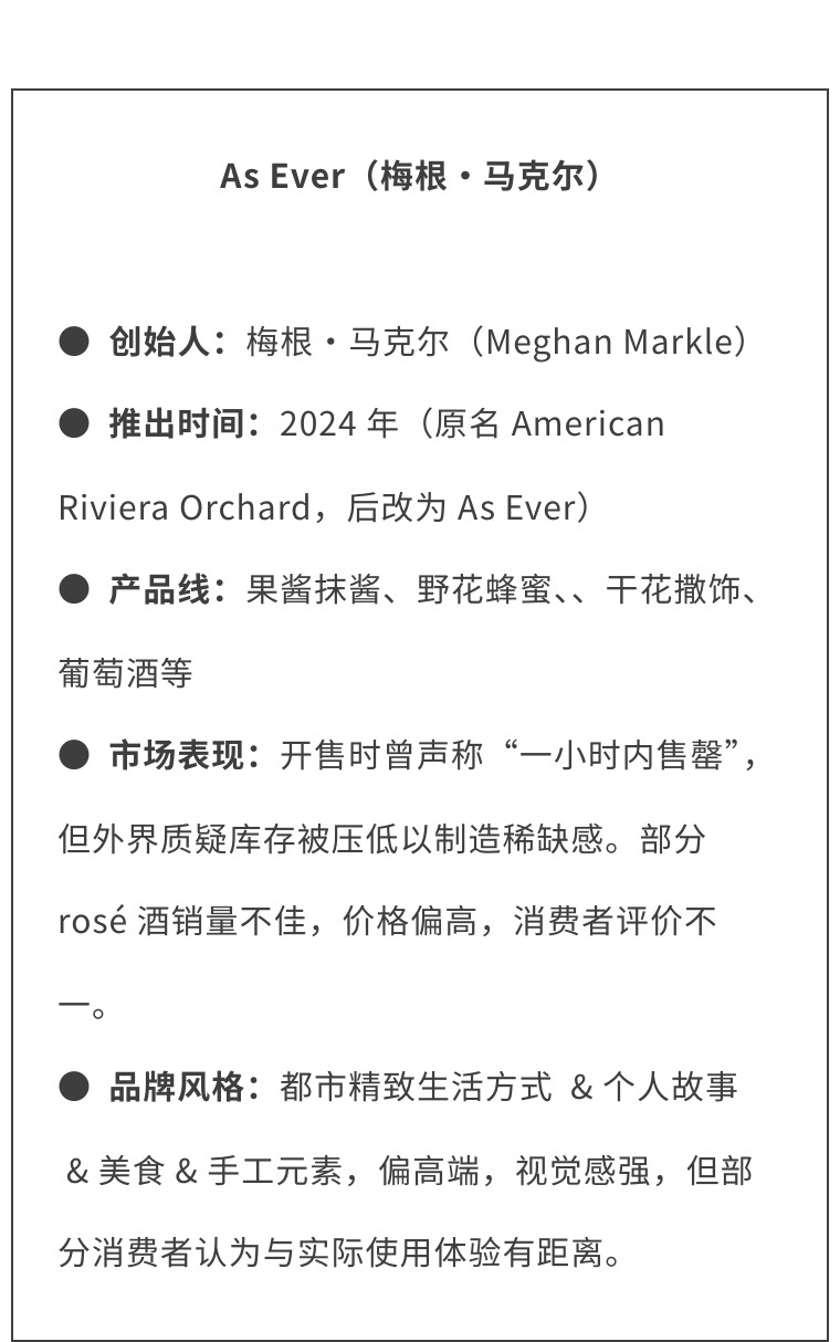 而梅根的 As Ever 已经有市场基础,但库存不稳、价格偏高、销售节奏受争议,短期热度不等于长期稳固。