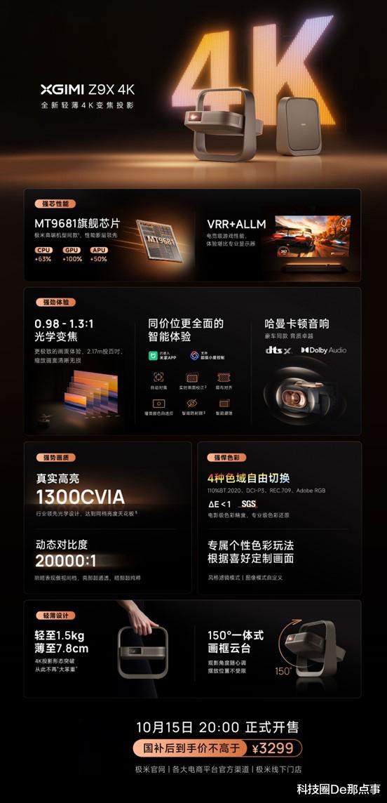 【科技圈De那点事-报道】10月10日消息,当4K投影仍被束缚在体积大、摆放难、不易挪动等常规认知时,极米 Z9X 4K以强者姿态轻装上阵,目前全平台已开启超前预约,国补后到手价不超过3299。10月15日晚上8点,极米 Z9X 4K将在极米官网及小程序、线下门店、各大电商平台正式现货开售,叠加双十一大促福利政策还有更多惊喜释放。