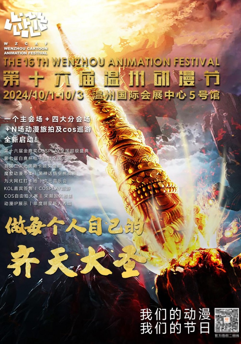 第十六届温州动漫节以“我们的动漫·我们的节日”为主题,整合以浙江为主辐射至全国的优秀动漫娱乐资源,以“1+4+N”为主打内容,即一个主会场、四个分会场、N个动漫旅拍和动漫嘉年华为核心,以“每个人都是自己的齐天大圣”为宣传口号,营动全城热恋的动漫氛围。其中主会场活动将于2024年10月1日至3日在温州国际会场中心举行,重点打造第十六届“金鹿奖”COSPLAY全国超级盛典、第七届“白鹿杯”全国电子竞技大赛、首届二次元奥斯卡颁奖典礼、黑神话悟空单机挑战赛、首届温州动漫妆造大赛、魔墅动漫市集、国乙恋与深空体验馆、熔岩火山、穿越黑神话悟空的世界等多项主题活动。同时组委会即邀约多名KOL嘉宾、B站UP主和抖音主播现场互动,呈现一场集“赛事、狂欢、市集、娱乐”为核心的动漫狂欢盛宴,为漫迷朋友们带来一场动漫世界的奇幻之旅。