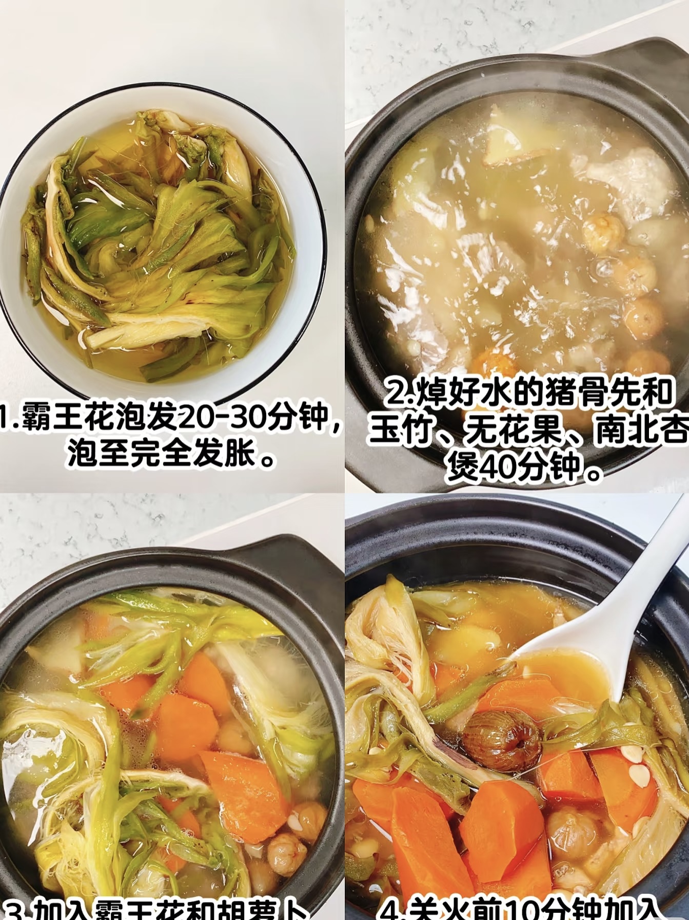 剩汤别倒,第二天加半碗燕麦煮“润嗓粥”,霸王花变成口感小星星,孩子抢着吃;或者过滤后冻成冰砖,下周拿来煮雪梨,咳嗽前期喝两杯,直接把火苗按灭在喉咙口。记住,这锅汤的灵魂是“时间”,小火慢炖才能把霸王花的胶质熬成“天然玻尿酸”,把猪骨的油香熬成“润肤乳”,像给五脏六腑做了个SPA,从内润到外。