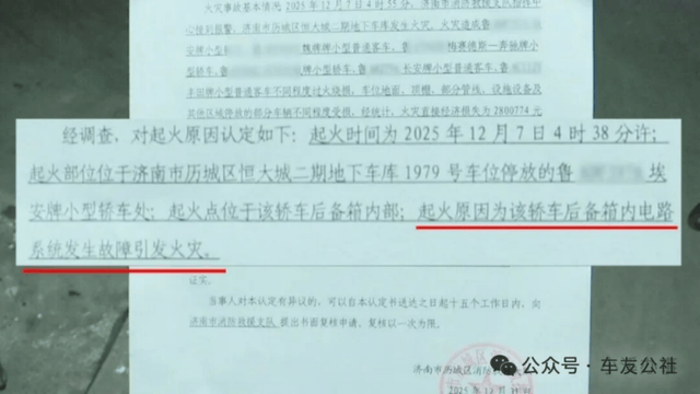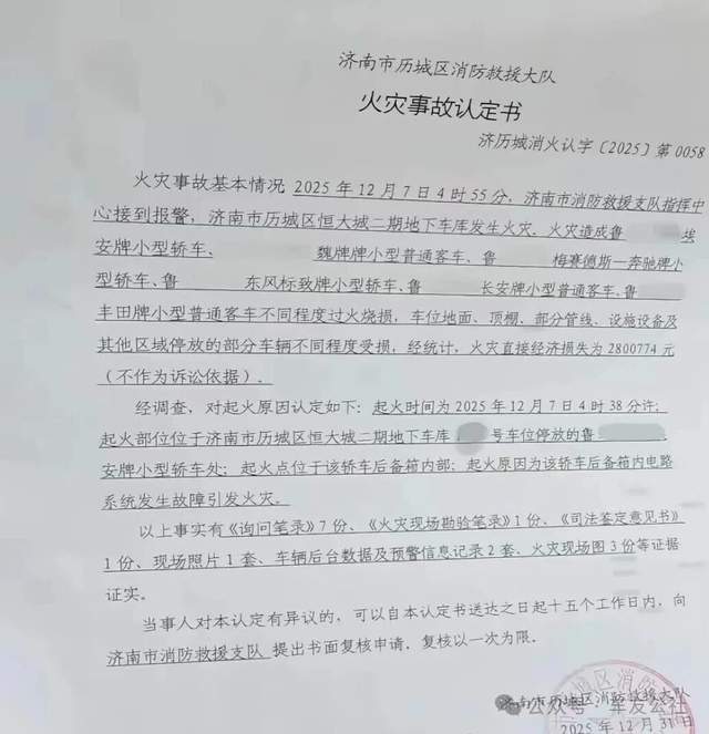 2025年12月31日,济南市历城区消防救援大队出具的《火灾事故认定书》认定,此次起火事件原因为“广汽埃安车辆后备箱内电路系统发生故障”。