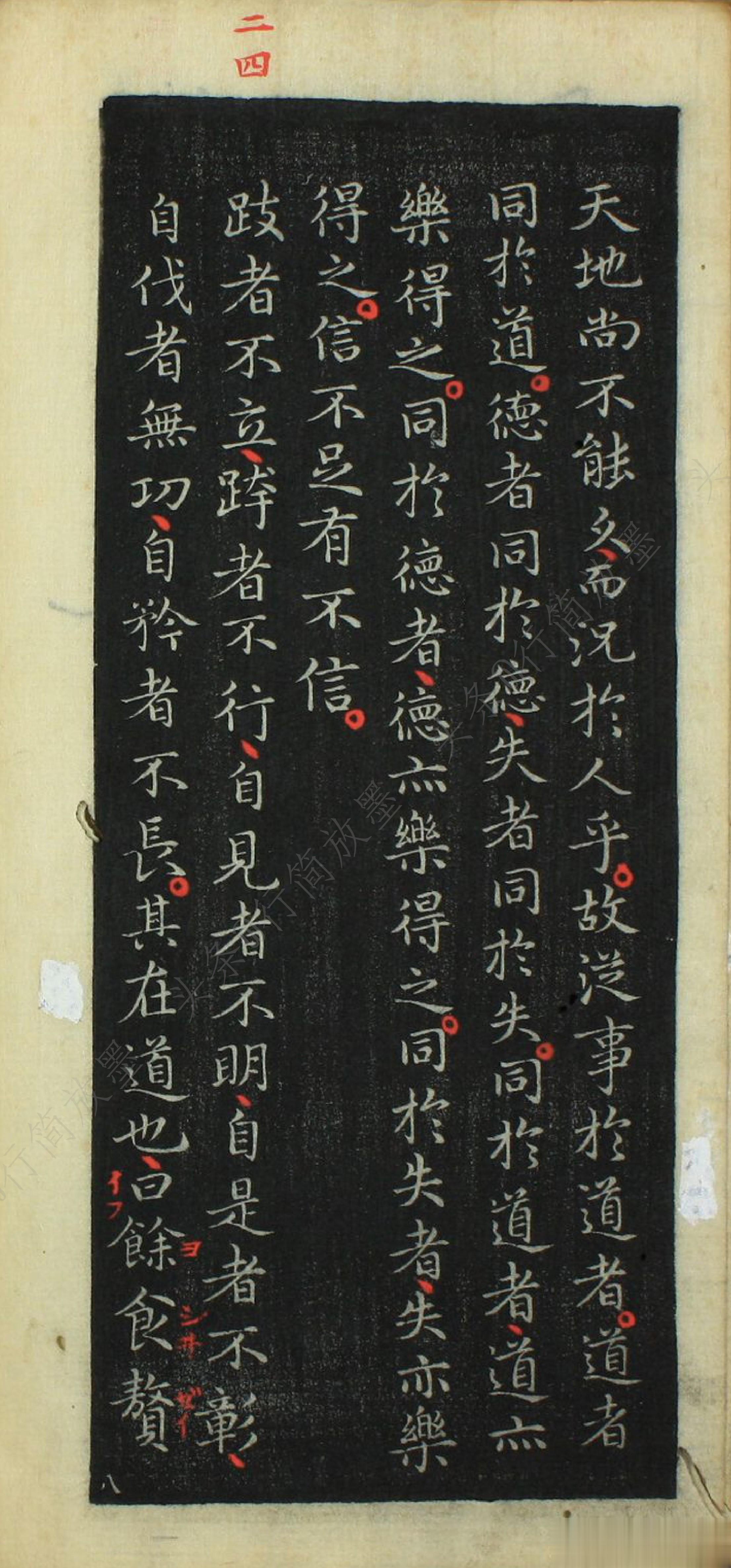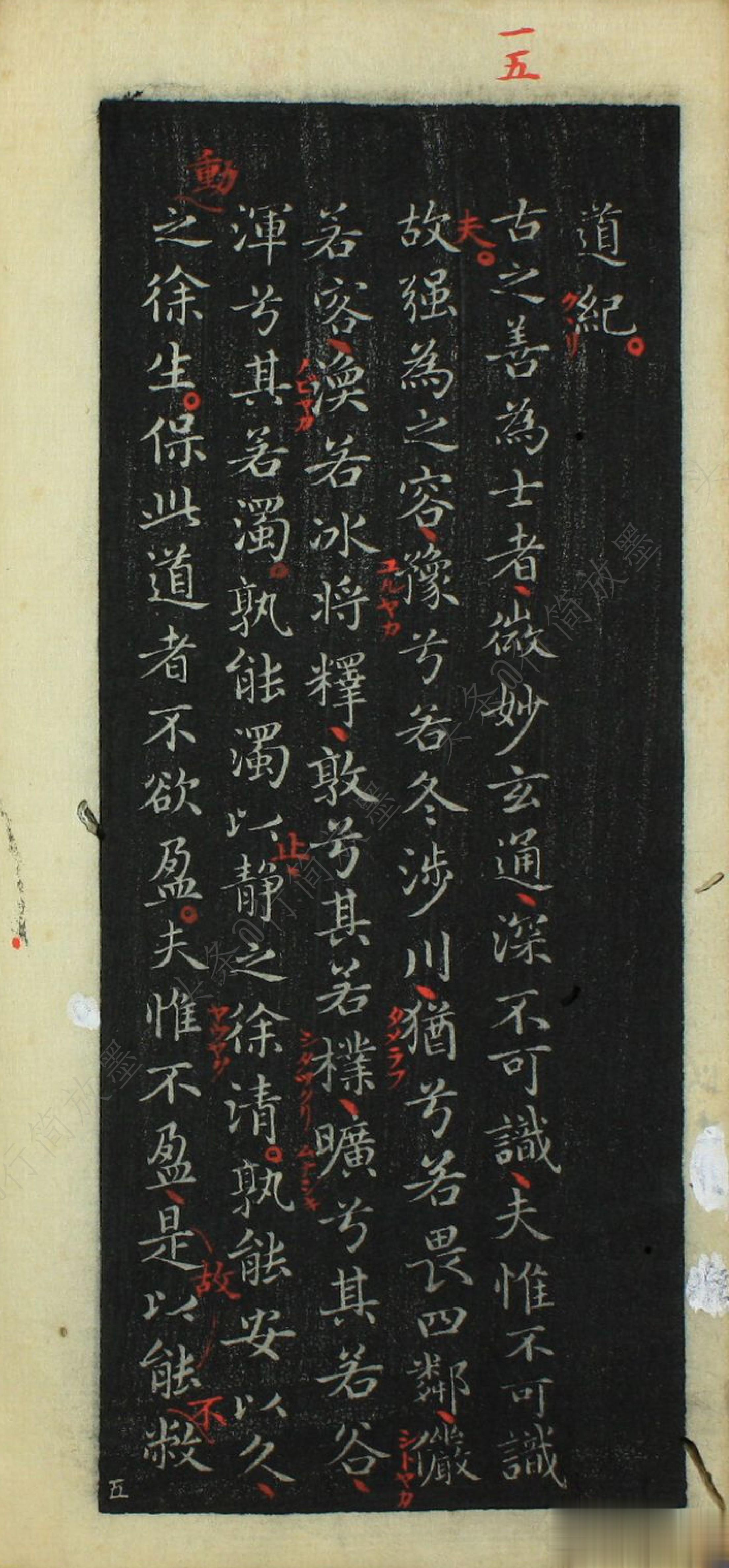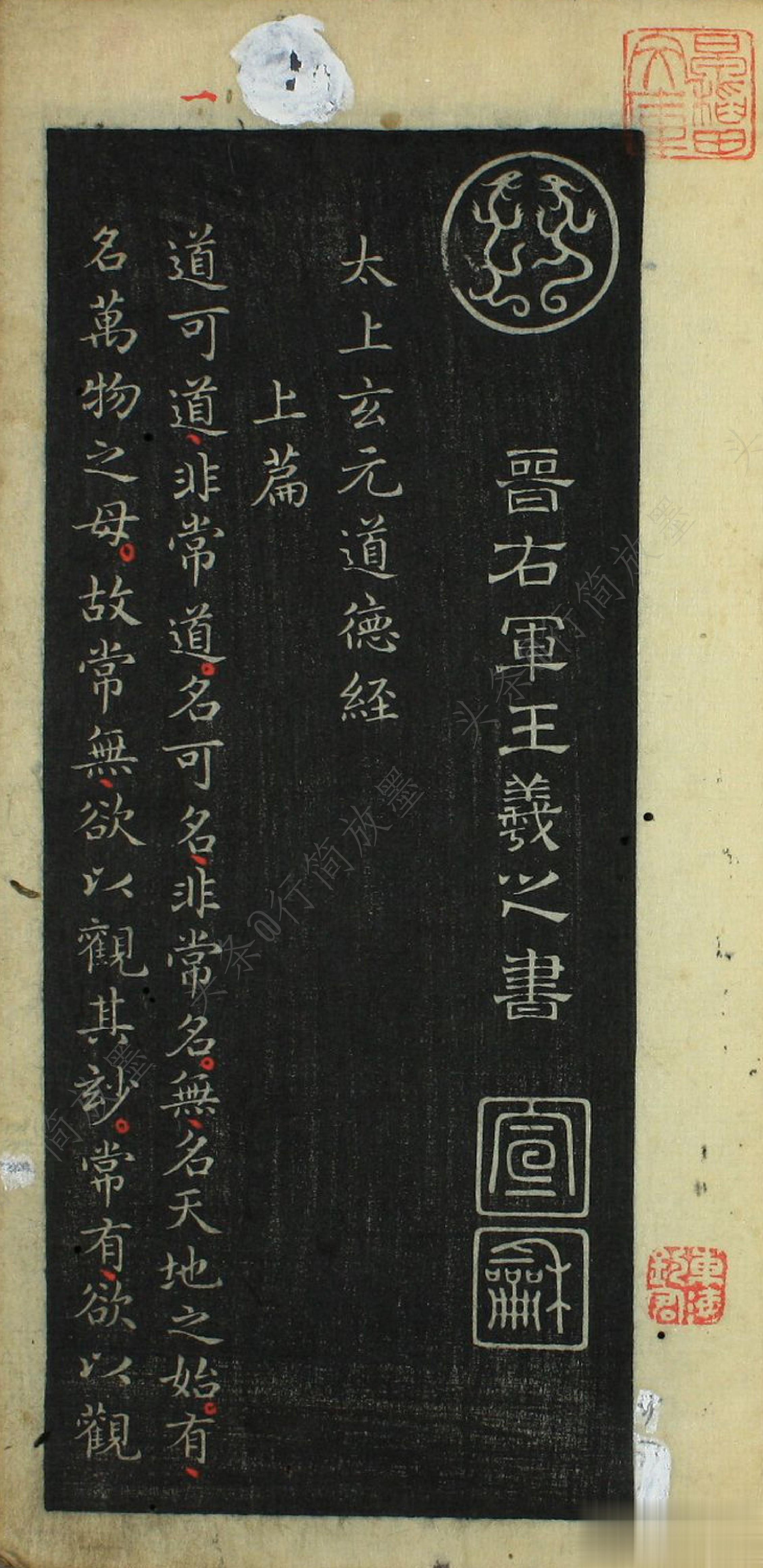 目前已知的版本中,有一个是王羲之小楷书写的《道德经》拓本,带有褚遂良的跋文,现藏于美国哈佛大学汉和图书馆。