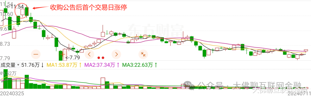 两人大额买入该股票后的次日,上市公司发布了收购公告,公告后首个交易日,股票涨停,但第二天该票就开始下跌,之后半个月里回撤了近30%。