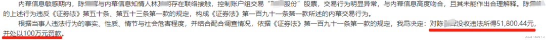 好友陈某,跑得倒是挺快,内幕公开后就把股票全卖了,本金716万元,最后卖完赚了5.18万元。赚是赚了点小钱,但还了借钱炒股的利息也没剩多少,事发后监管按盈利没收利润,不仅亏了利息,还被罚了100万元。