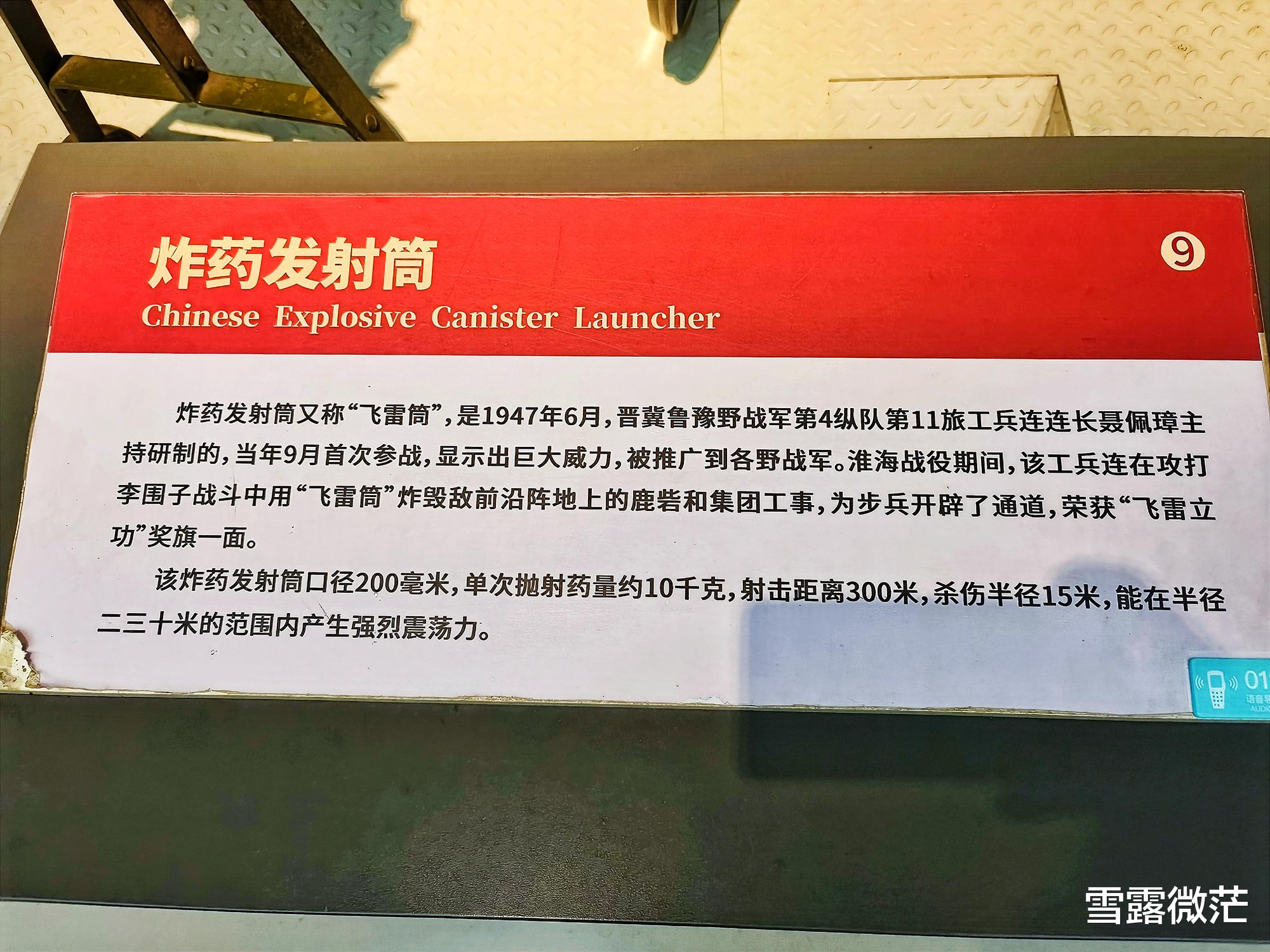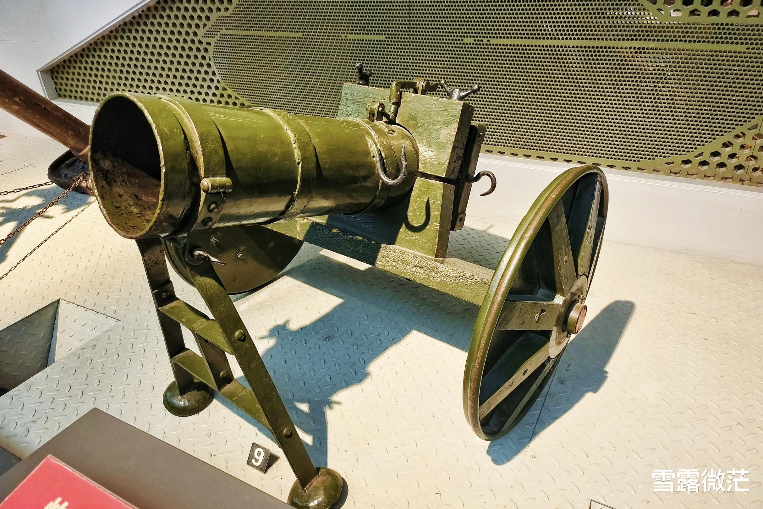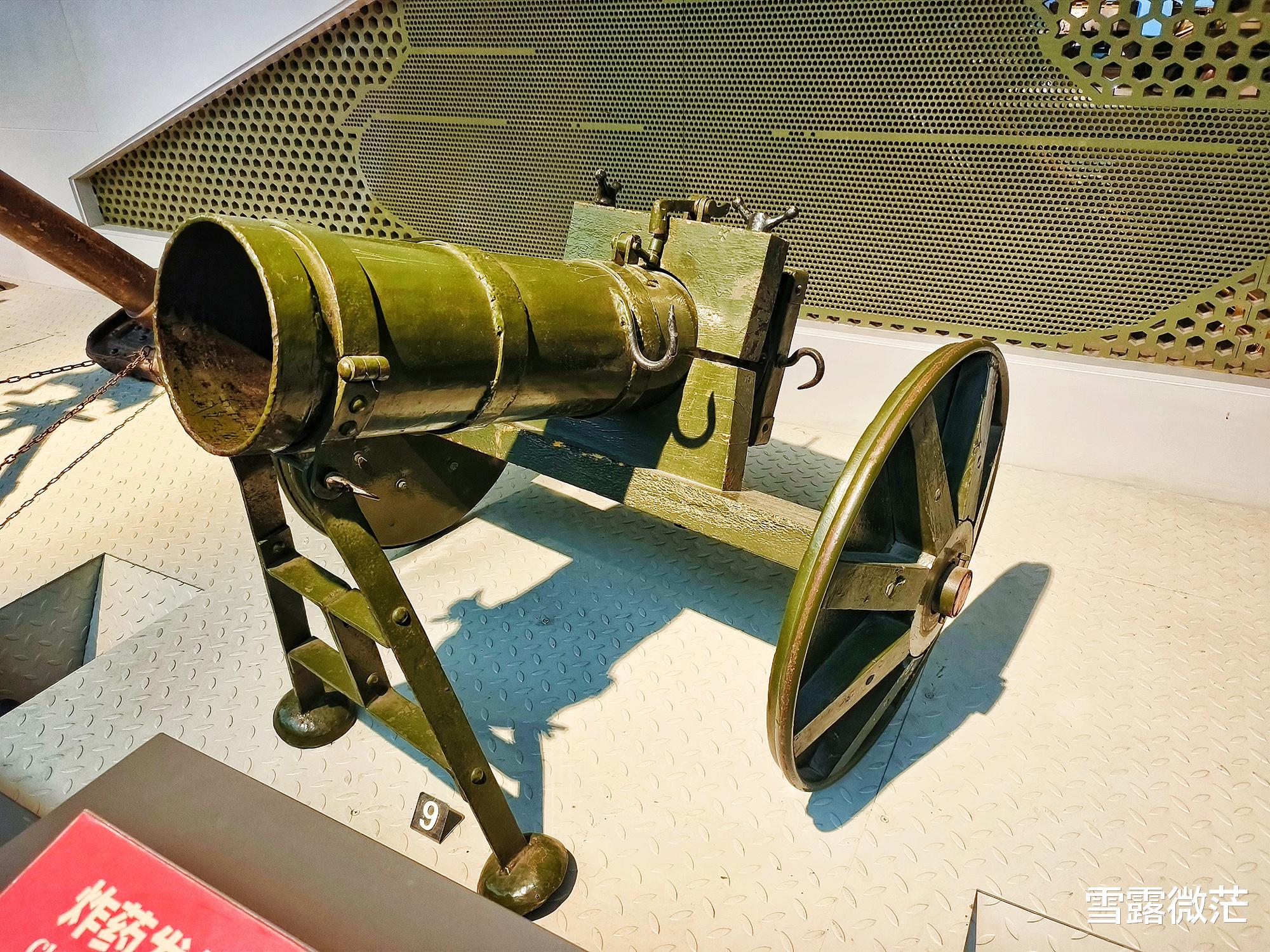 北京军事博物馆里这个炸药发射筒是个小号,口径200毫米,单次抛射药量约10公斤,射击距离300米,杀伤半径15米,能在半径二三十米的范围内产生强烈震荡力。