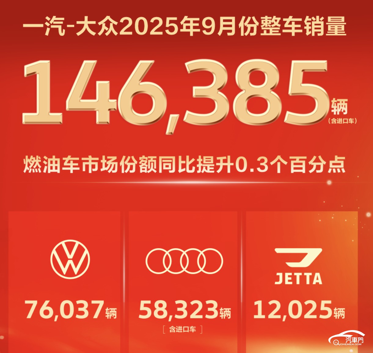 一汽-大众稳居合资车企销量榜首的同时,更在此基础上实现了销量的持续上涨。9月,一汽-大众售出了146385辆(含进口车),环比增长7.8%,同比增长1%。其中,大众品牌作为销量主力,共卖出了76037辆,占一汽-大众整体销量的52%。一汽奥迪贡献了58323辆(含进口车),同比增长了13.5%。捷达品牌销量12025辆,同比增长了19.8%。